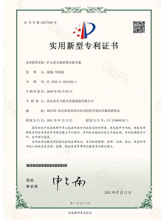 礦山采石破碎篩分除塵器-礦山采石破碎篩分除塵器實用證書-宏大除塵設備