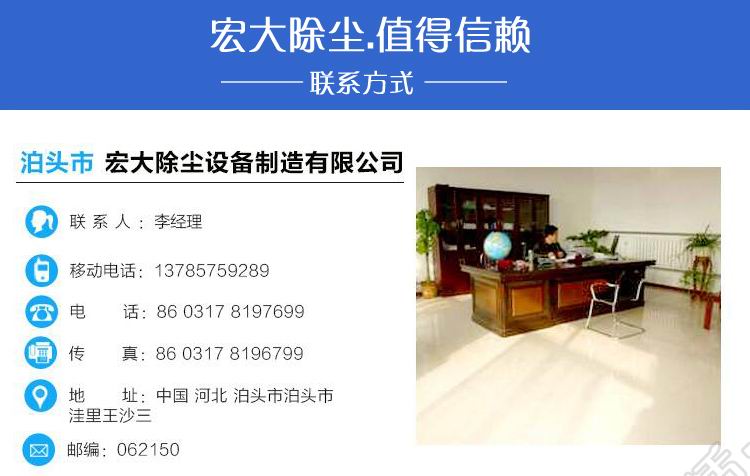 公司名稱:泊頭市宏大除塵設備制造有限公司 公司地址:泊頭市開發區環城東路南首1號 電話:0317-8392799 8162866 傳真:0317-8392977